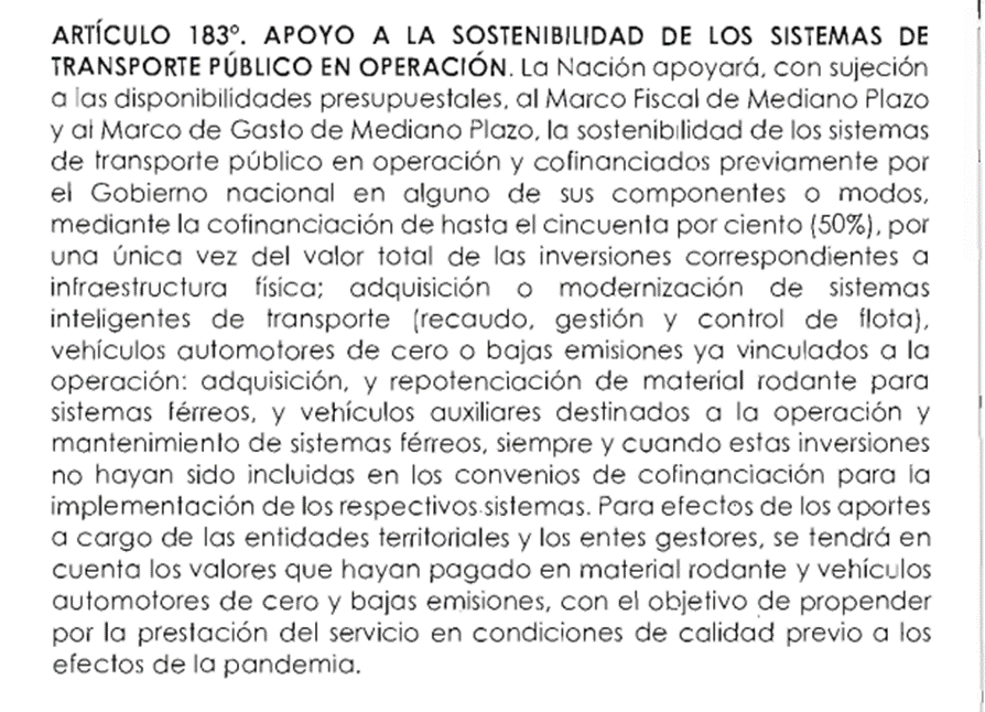 Para reducir el desbalance en el tiempo también serán útiles la construcción de troncales (el costo operacional es menor en troncales que en SITP zonales en 14%) y la entrada de las línea de metro (que reducen la necesidad de buses y tienen 100% de cobertura de costos de equipos con recursos públicos). También es muy valiosa la disposición del Plan Nacional de Desarrollo 2022 – 2026 que permitirá cubrimiento de 50% de costos de capital de los Sitms y Setps (artículo 183, Ley 2294 de 2023), que permitirá cubrimiento de 50% de costos de capital de los Sitms y Setps (artículo 183, Ley 2294 de 2023).