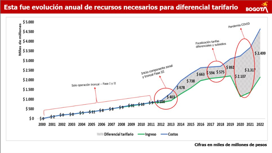 Bogotá fue exitosa manteniendo equilibrio de ingresos y costos en TransMilenio hasta 2012. A partir de ese año, con la entrada parcial del SITP zonal, con la expansión de las troncales de la Carrera 10 y Calle 26-Avenida El Dorado, y con los servicios duales (principalmente por la Carrera Séptima conectados a varias troncales), el déficit creció. Fue posible reducirlo un poco entre 2016 y 2018 con incremento de tarifas y gestión operacional; pero volvió a subir en 2019 con renovación de flota y expansión de servicios SITP zonales. Luego llegó la pandemia, que afectó sustancialmente los ingresos y un incremento notable en el no pago (evasión) de tarifas, que pasó de 17% en 2019 a 30% en 2022 en los servicios troncales.